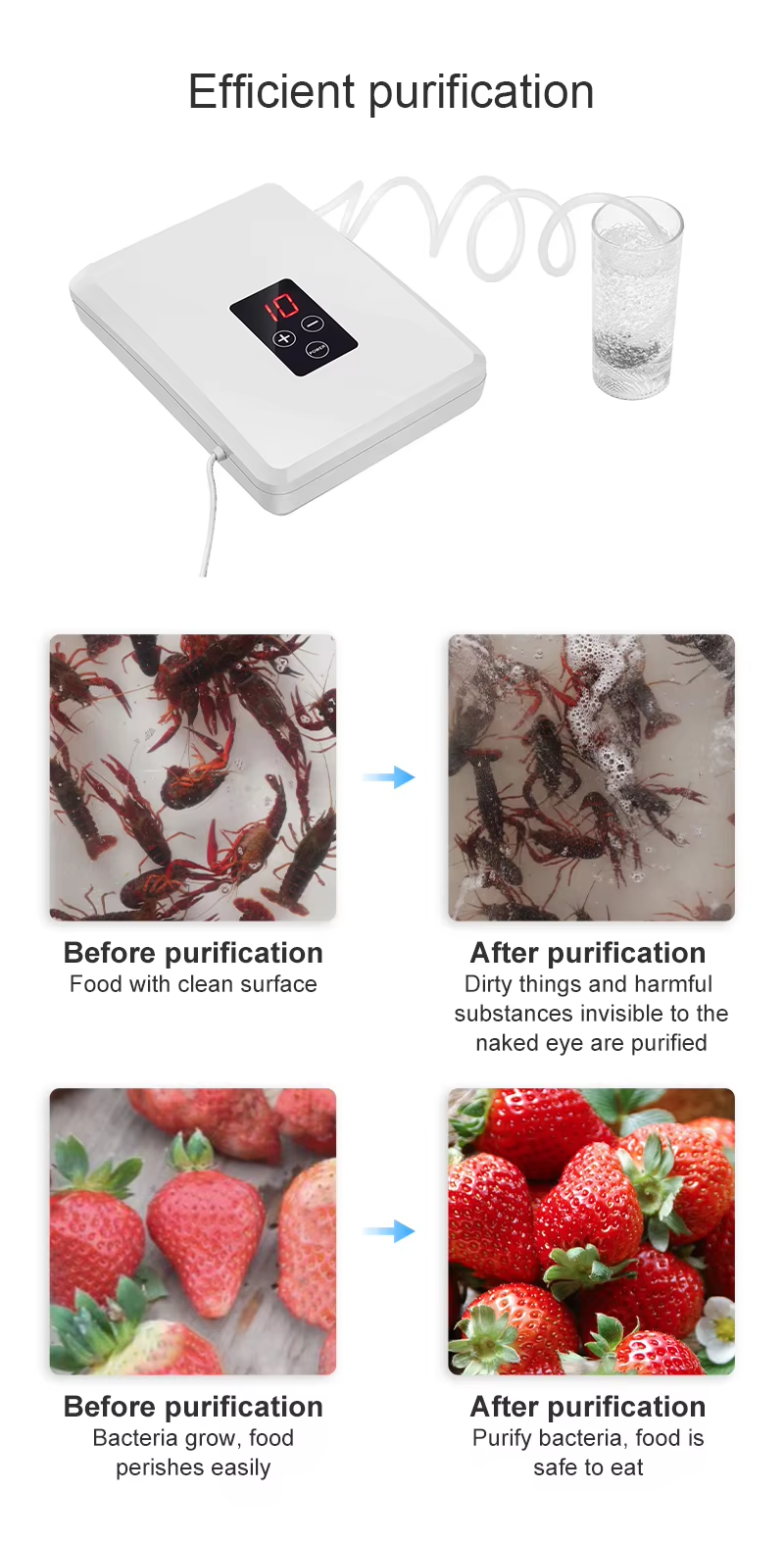 1. Sterilization: vegetable,fruit meat ,product purification