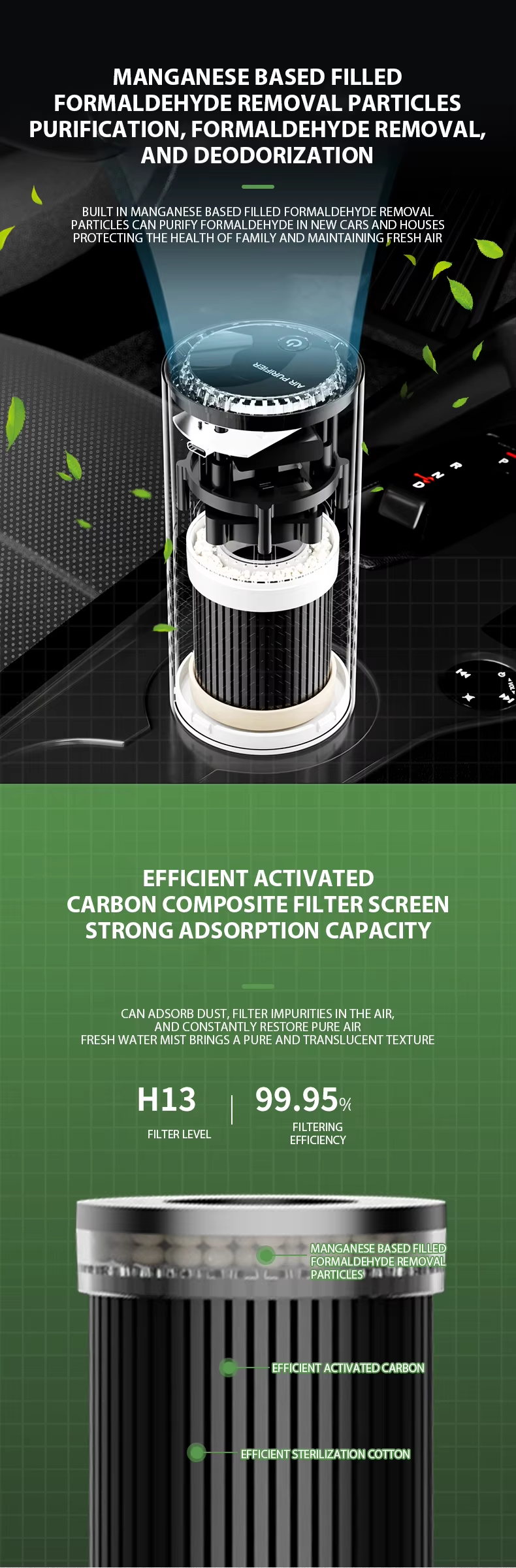 - Pure Air on Demand: Equipped with a true HEPA filter and an activated carbon filter, our dual-filtration system captures 99.97% of airborne particles as small as 0.3 microns, including dust, pollen, pet dander, and smoke. The carbon layer effectively neutralizes unpleasant odors from food, pets, or traffic fumes, leaving your car smelling